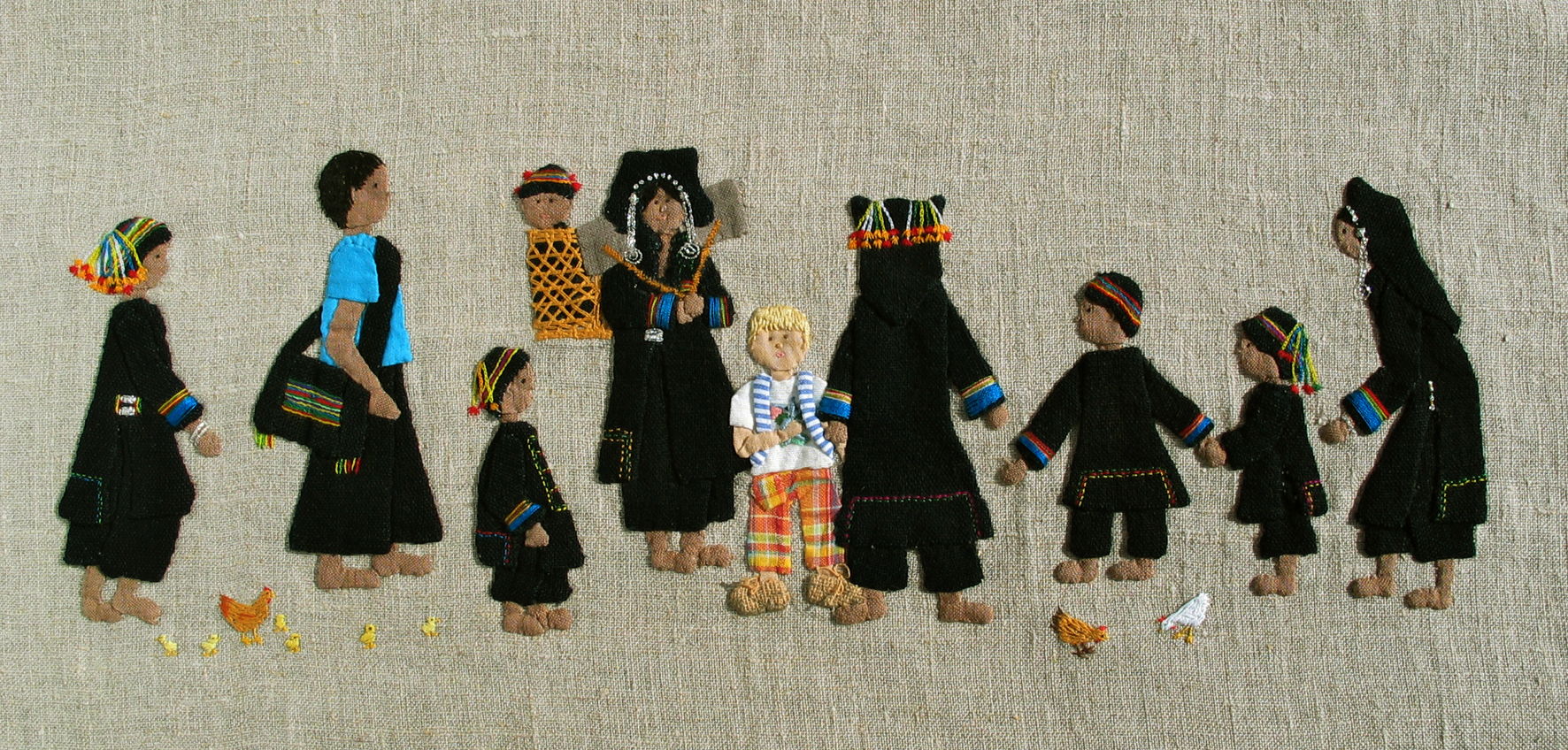 Petite, j’imaginais les fonds marins plantés d’arbres à fruits de mer multicolores et je cousais des accoutrements pour les voyages de mes poupées. Plus grande, je rafistolais mes habits tout en étudiant l’agriculture et la géographie pour partir à mon tour vers des contrées lointaines. J’en suis revenue avec des carnets brodés, un lien étroit avec des artisanes du Laos et l’âme d’une brodeuse sans frontières.