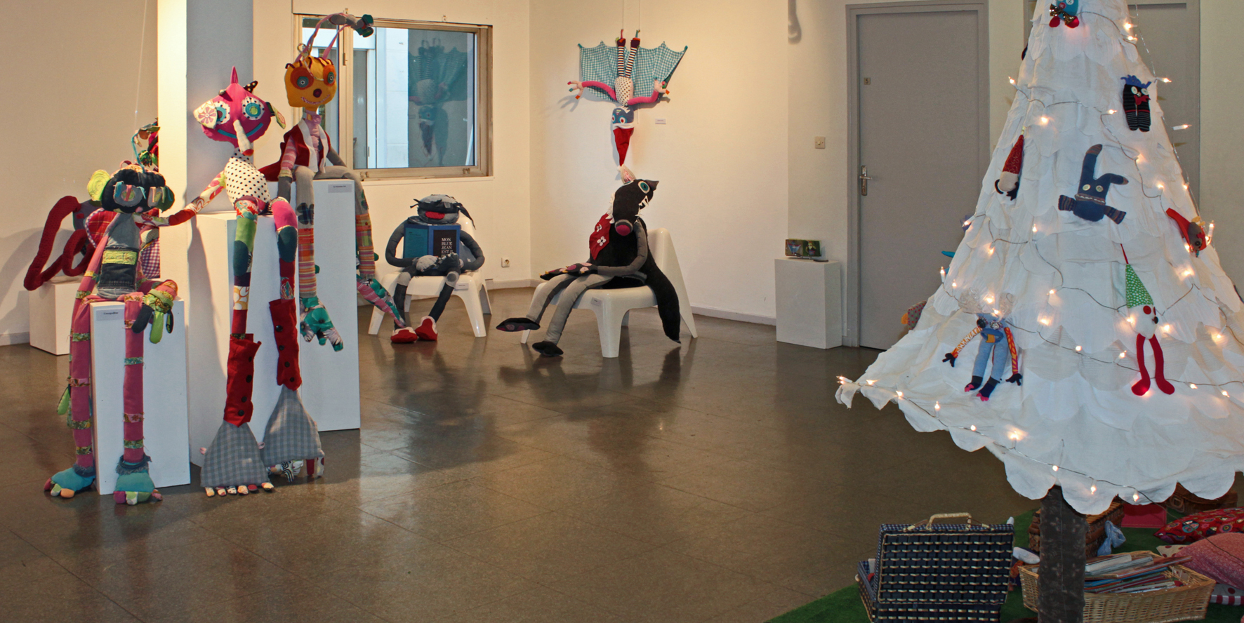 Une douzaine de grands personnages en tissu portant des accessoires cousus dans l’habit Père Noël