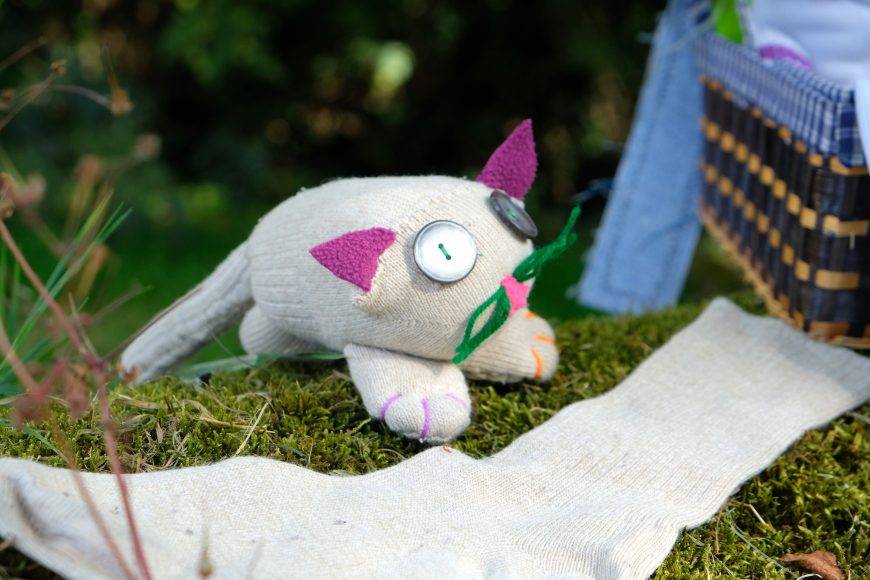 Un sapin de Noël en tissu décoré de doudous en chaussettes