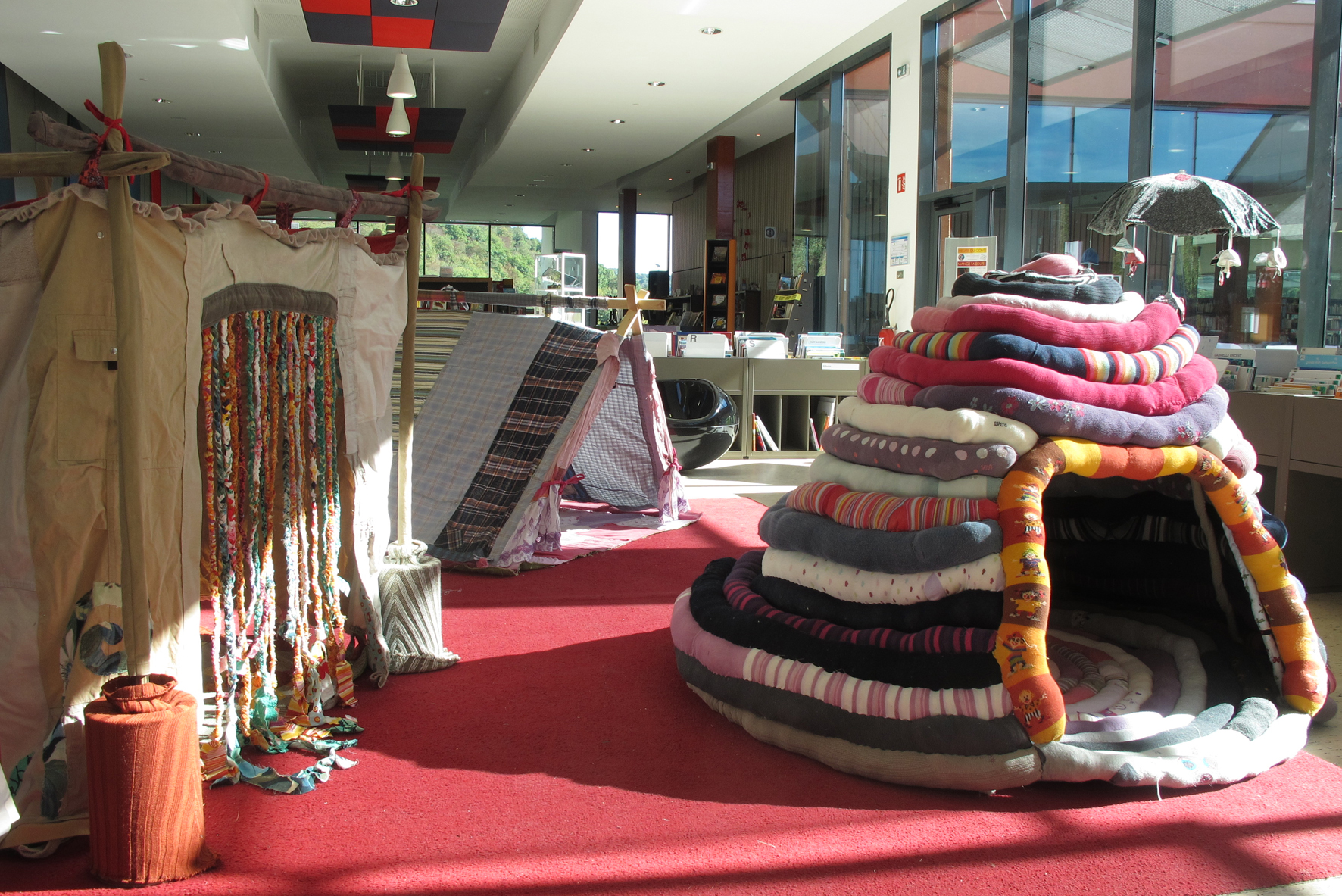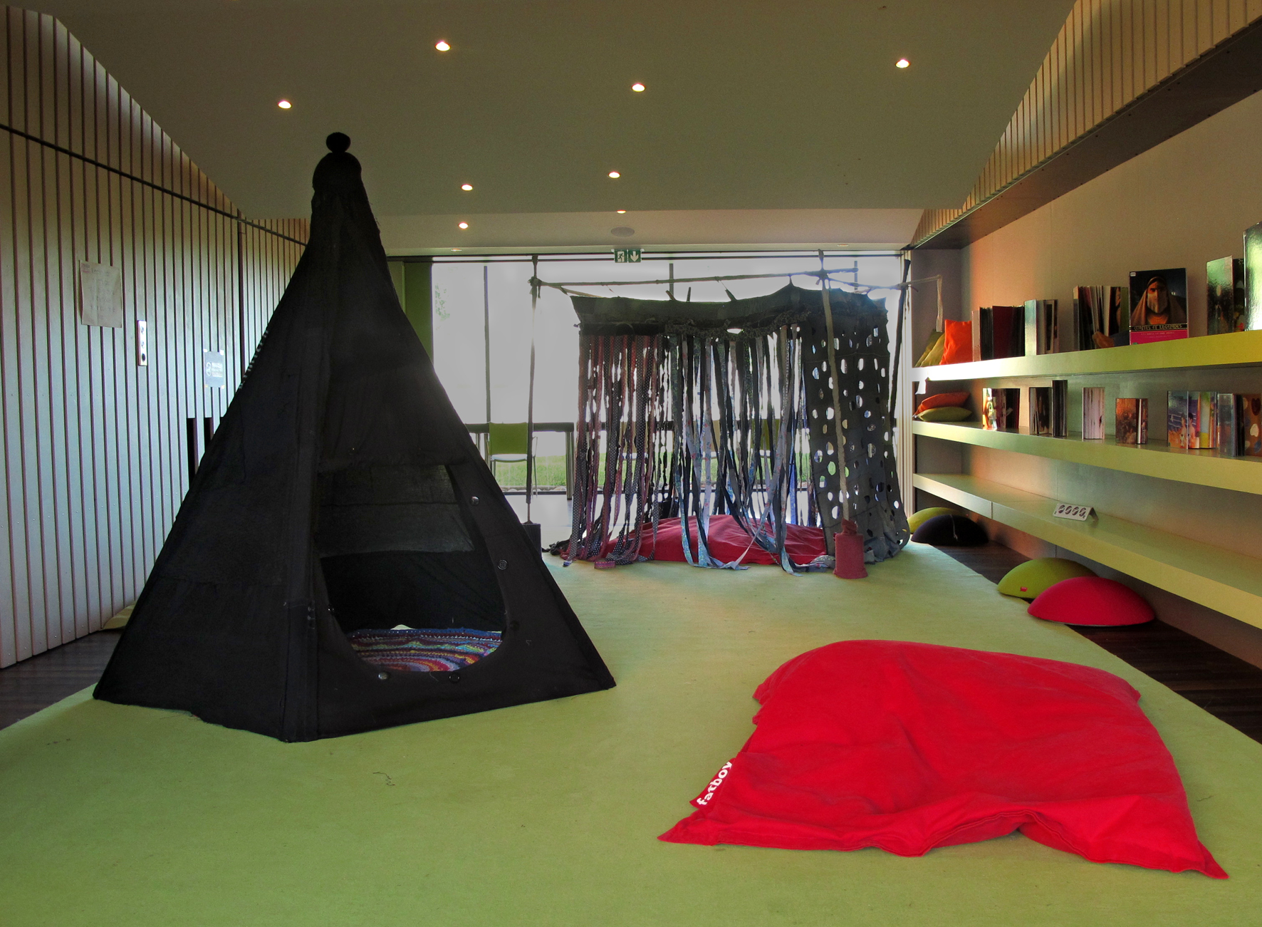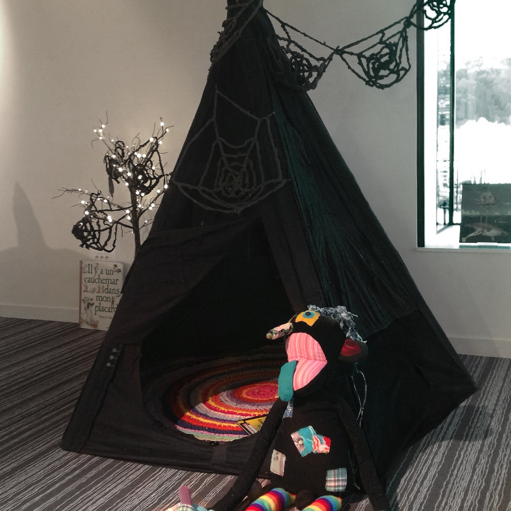 Dans ce petit campement cousu de bric et de broc, on peut venir se reposer, rêver, y lire des histoires, découvrir des objets pour les raconter.