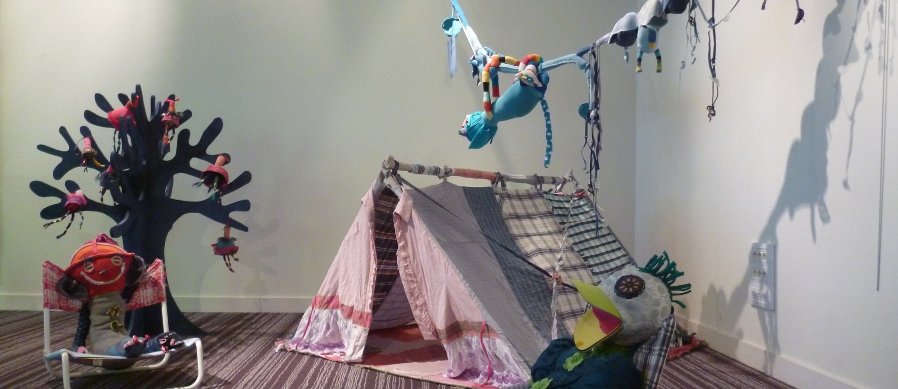 Dans ce petit campement cousu de bric et de broc, on peut venir se reposer, rêver, y lire des histoires, découvrir des objets pour les raconter.