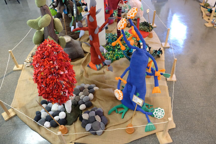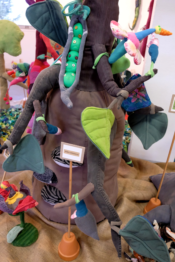 Arbres, fleurs et plantes diverses cousues dans des vieux vêtements et des napperons.